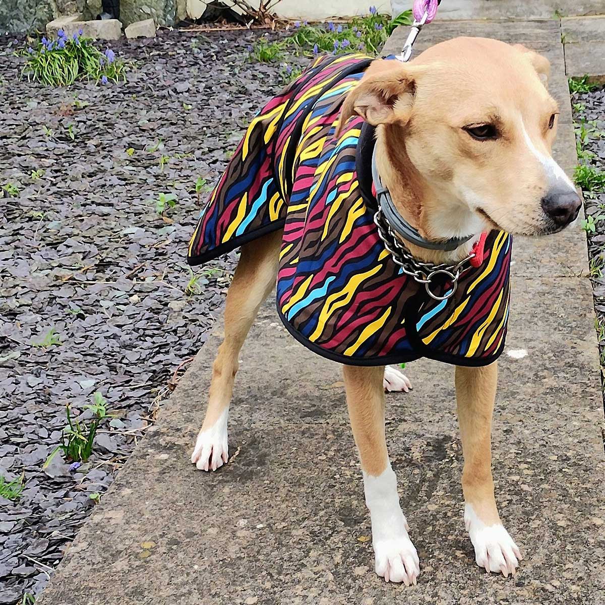 Inspired by the bold markings of a zebra and reimagined in vivid, head-turning colour, the Savanna Coat is designed exclusively for the sleek lines of sighthounds such as the Whippet, Greyhound and Italian Greyhound.