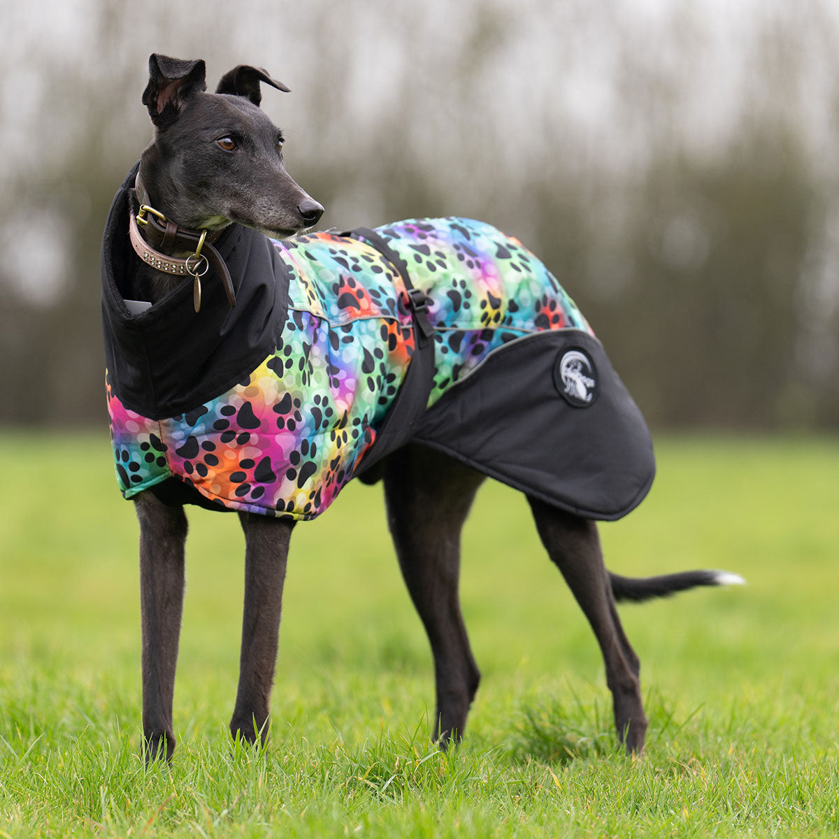 The Envis Sighthound Coat is the stylish choice for keeping your dog warm, dry, and stylish! Crafted with a high neck, polar fleece lining, adjustable waist strap and reflective strip, your dog can stay comfortable and warm in the worst of weather. Plus, the attractive rainbow-paw design will ensure your dog is the most fashionable dog on the street! The reflective detailing makes sure your dog can be seen on dark walks. The Envis has two waterproof zips to able you to attach your lead, one to use with a collar and one for a Drydogs harness.